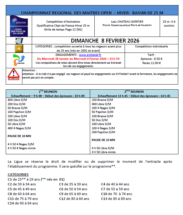 Cette compétition est ouverte aux nageurs de plus de 25 ans (né en 2001 et avant), compétition d’animation qualificative pour les championnats de France hiver (N1) en bassin de 25m.